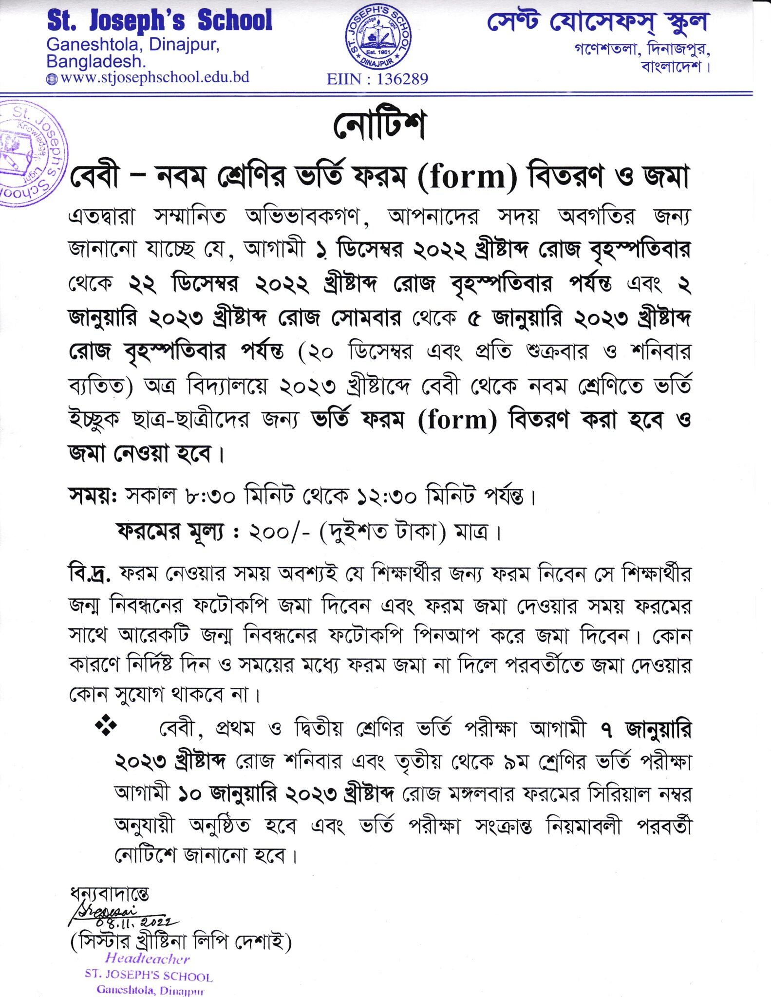 ২০২৩ খ্রীষ্টাব্দের বেবী থেকে ৯ম শ্রেণির ভর্তি ফরম বিতরণ ও জমা প্রসঙ্গে