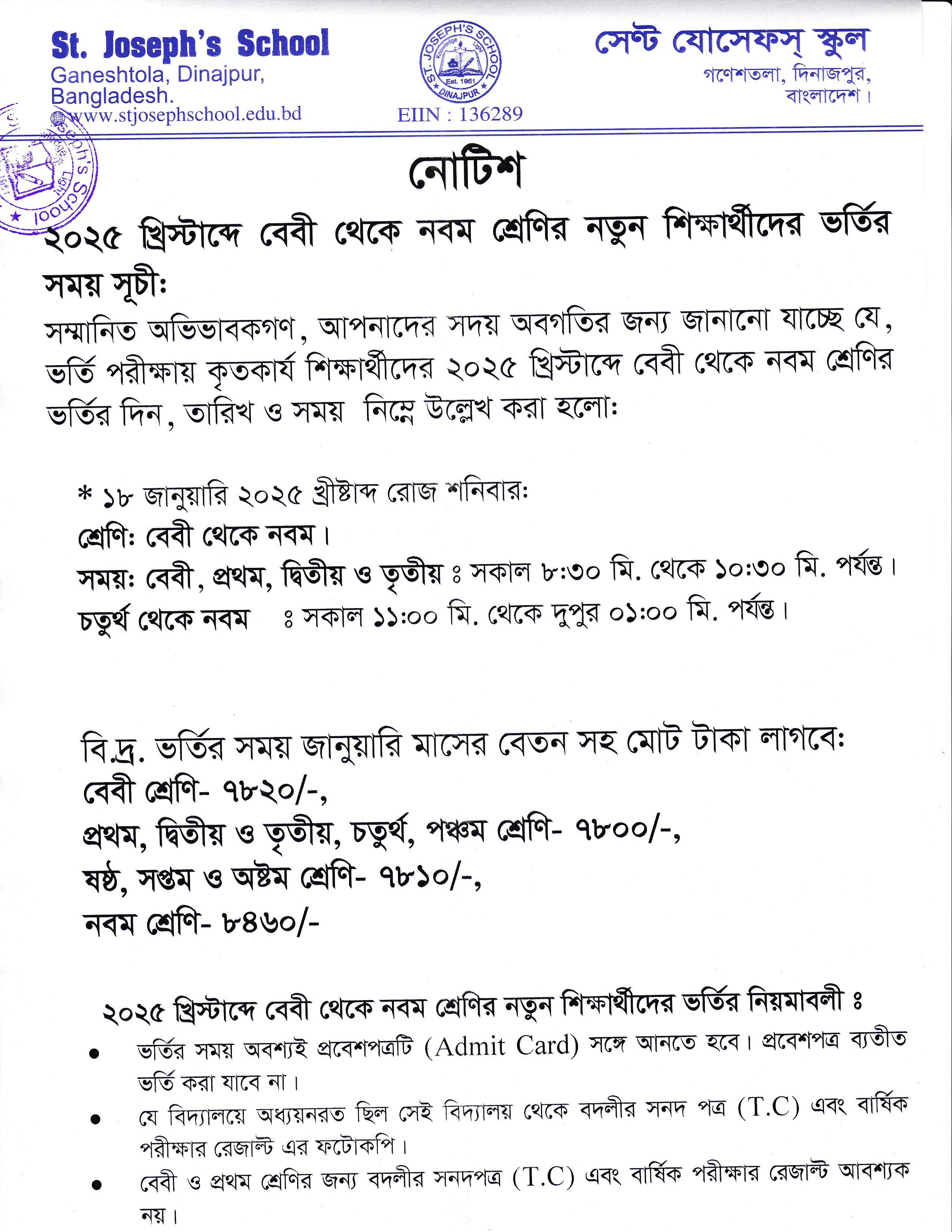 ২০২৫ খ্রিস্টাব্দে বেবী থেকে নবম শ্রেণির নতুন শিক্ষার্থীদের ভর্তি পরীক্ষার ফলাফল ও ভর্তির সময় সূচী প্রসঙ্গে