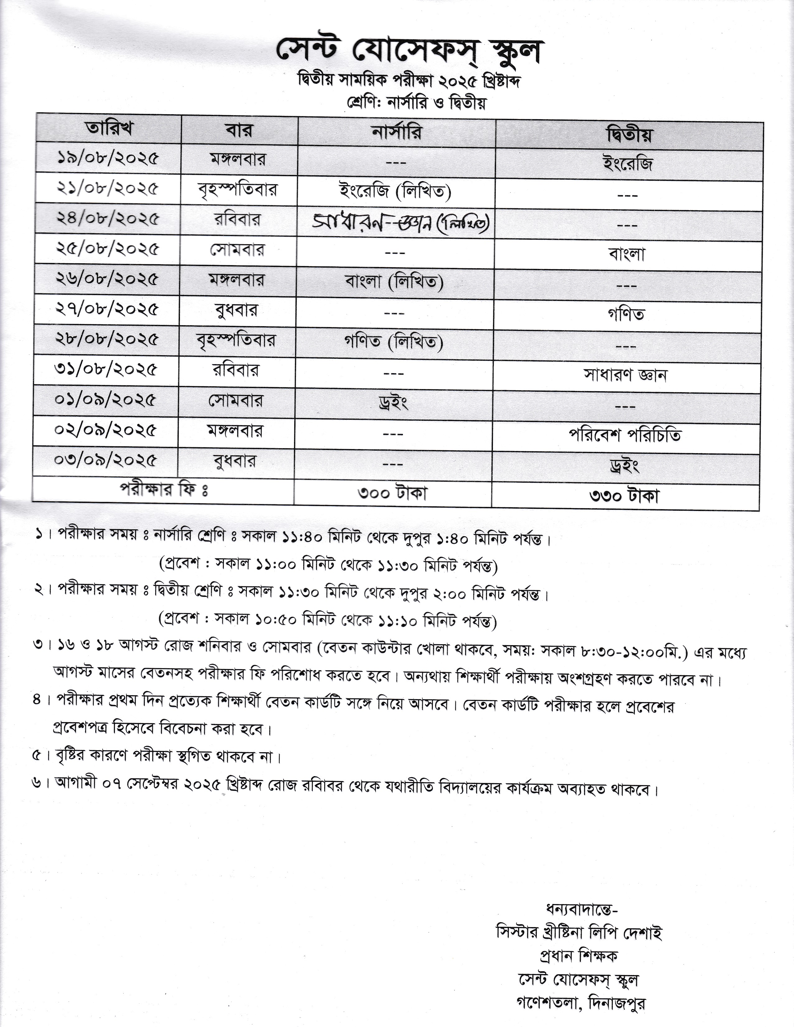 দ্বিতীয় সাময়িক/অর্ধ-বার্ষিক/প্রাক নির্বাচনী পরীক্ষা ২০২৫ খ্রি: এর রুটিন (নার্সারি থেকে দশম শ্রেণি)