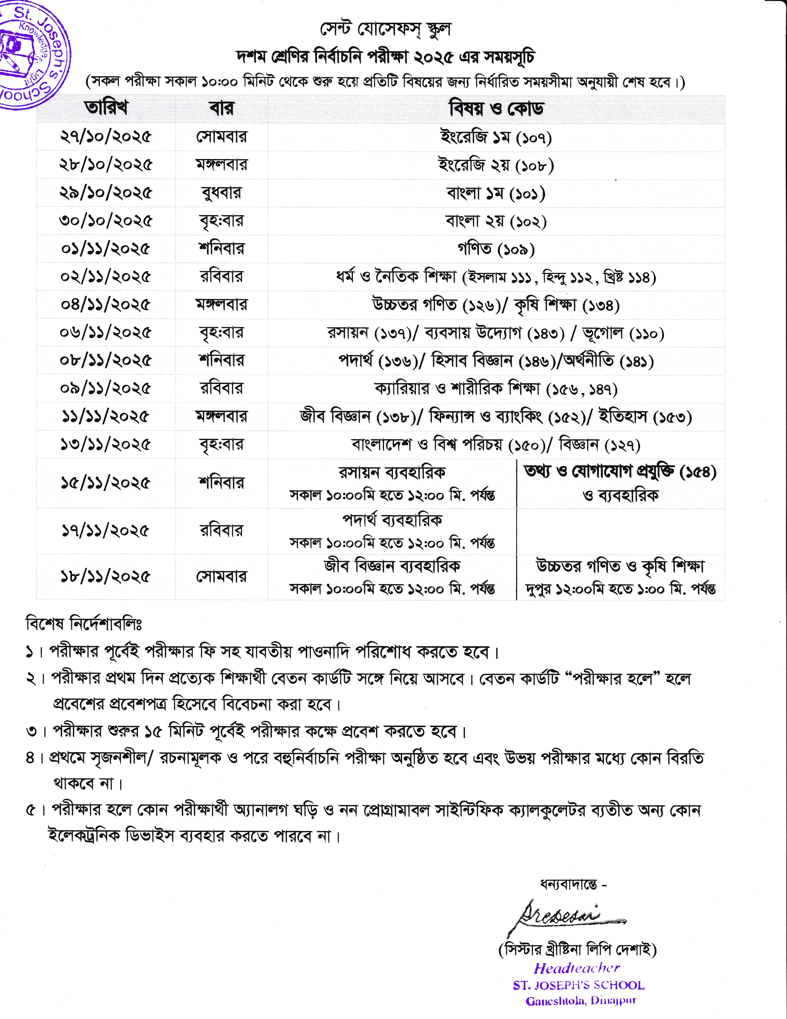 দশম শ্রেণির নির্বাচনি পরীক্ষা ২০২৫ এর সময়সূচি