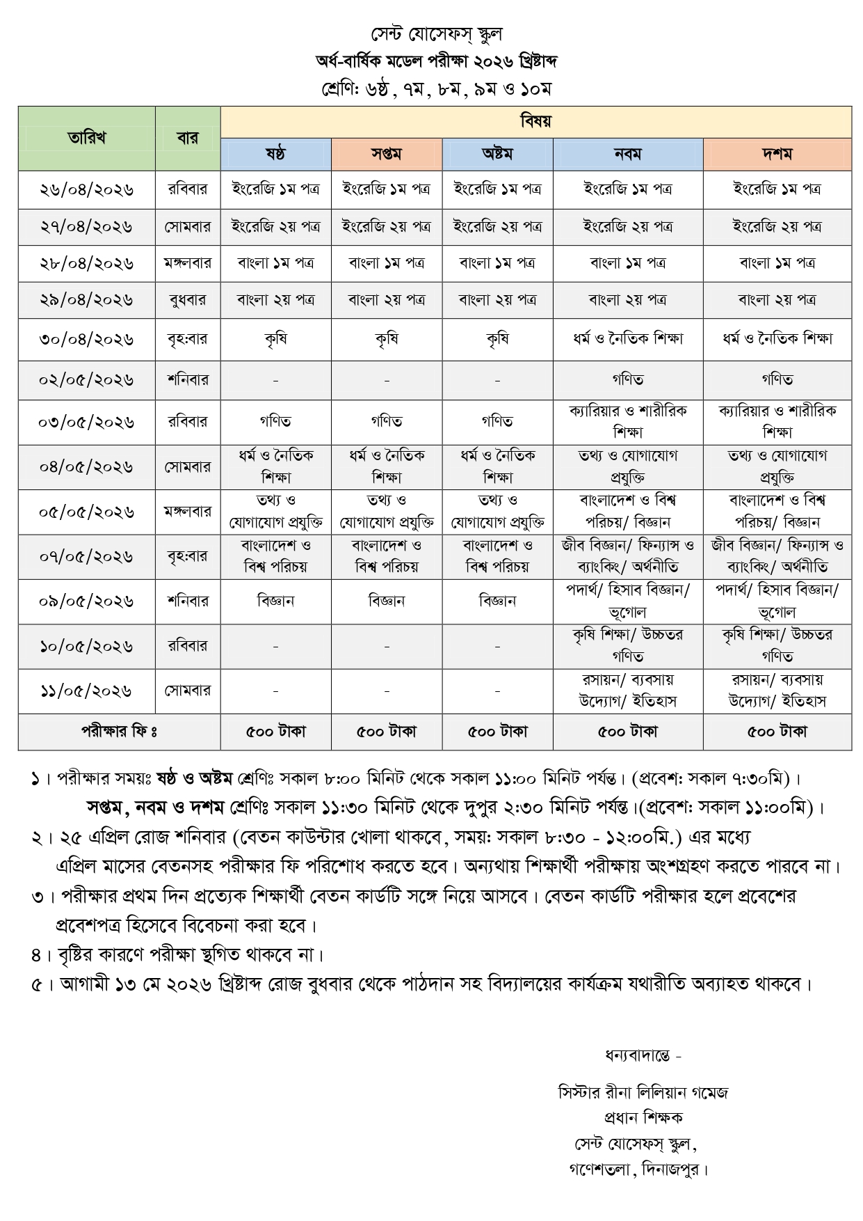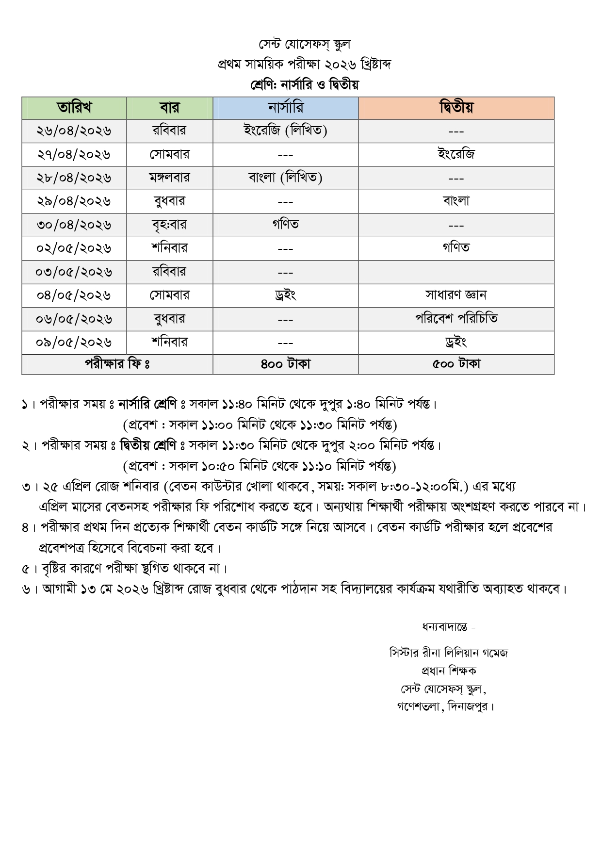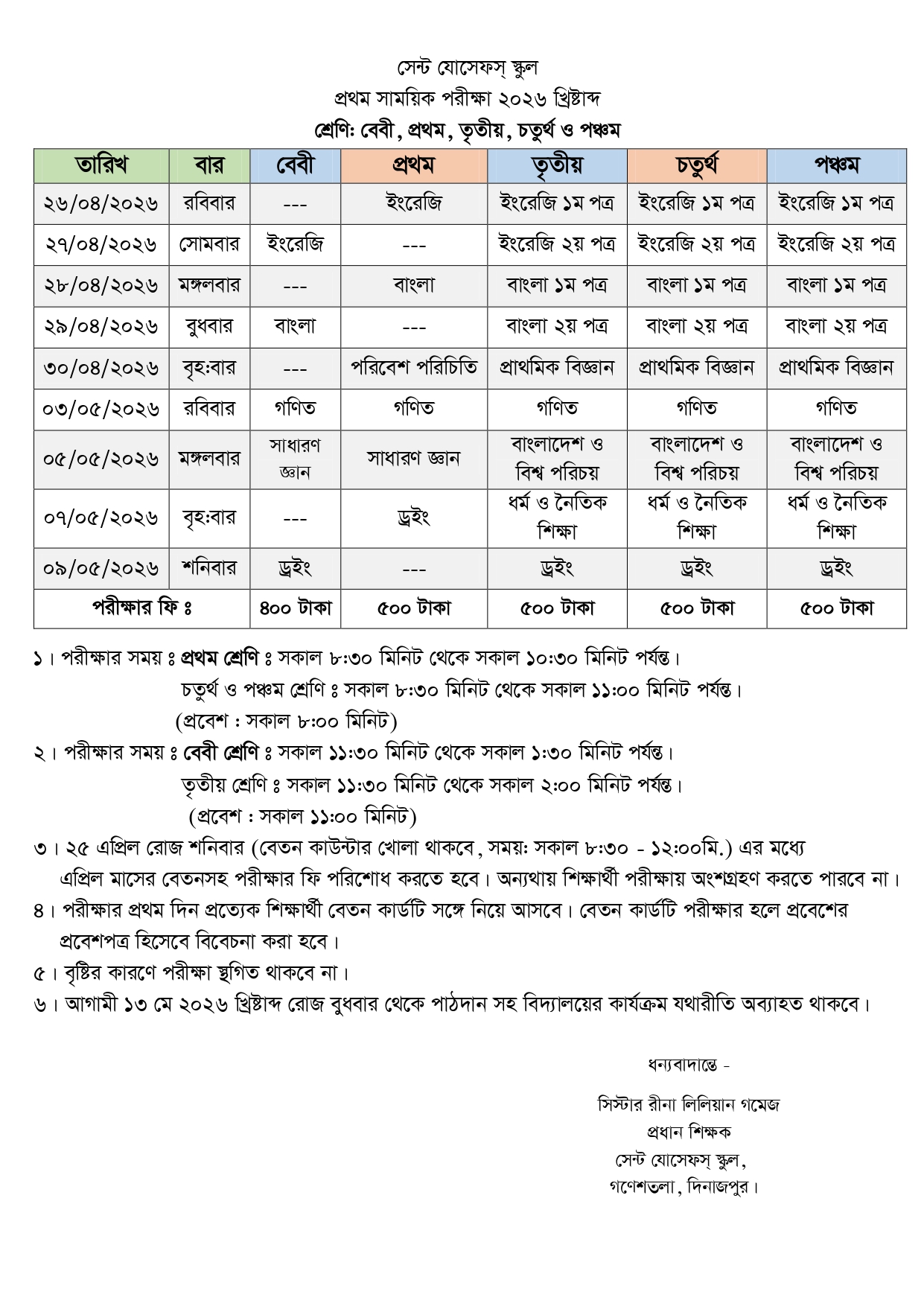 প্রথম সাময়িক ও অর্ধ-বার্ষিক পরীক্ষার রুটিন (নার্সারি থেকে ১০ম শ্রেণি) ২০২৬ খ্রি:
