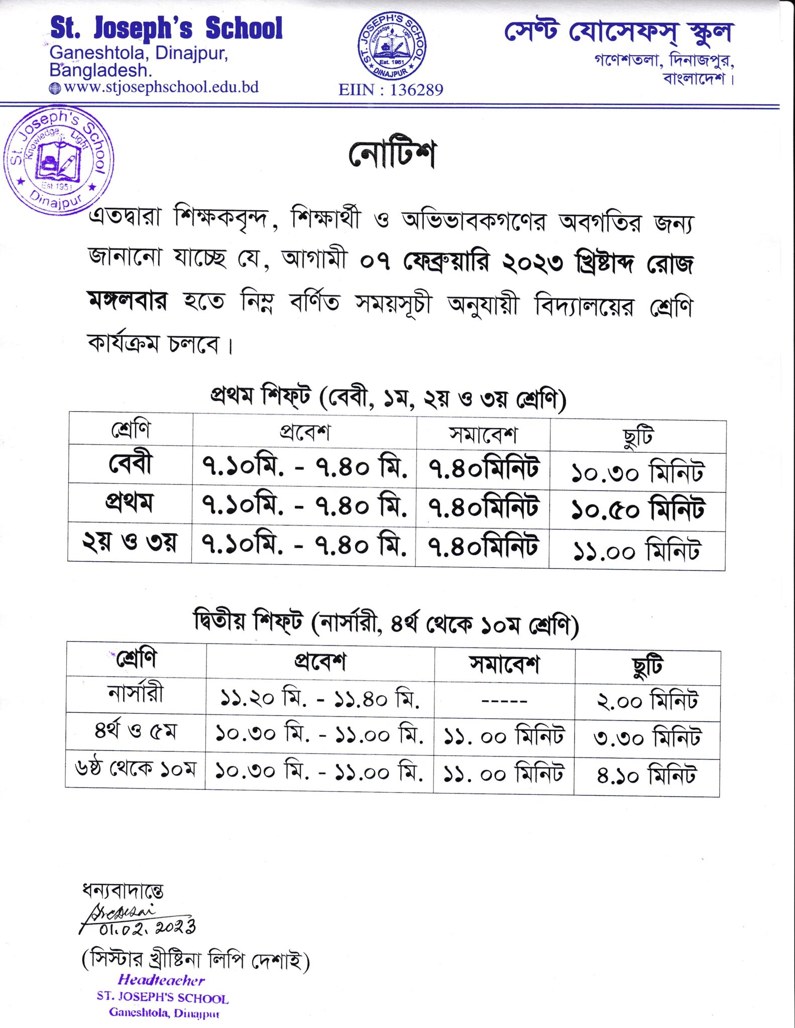 ২০২৩ খ্রি: বিদ্যালয়ের সময়সূচী প্রসঙ্গে