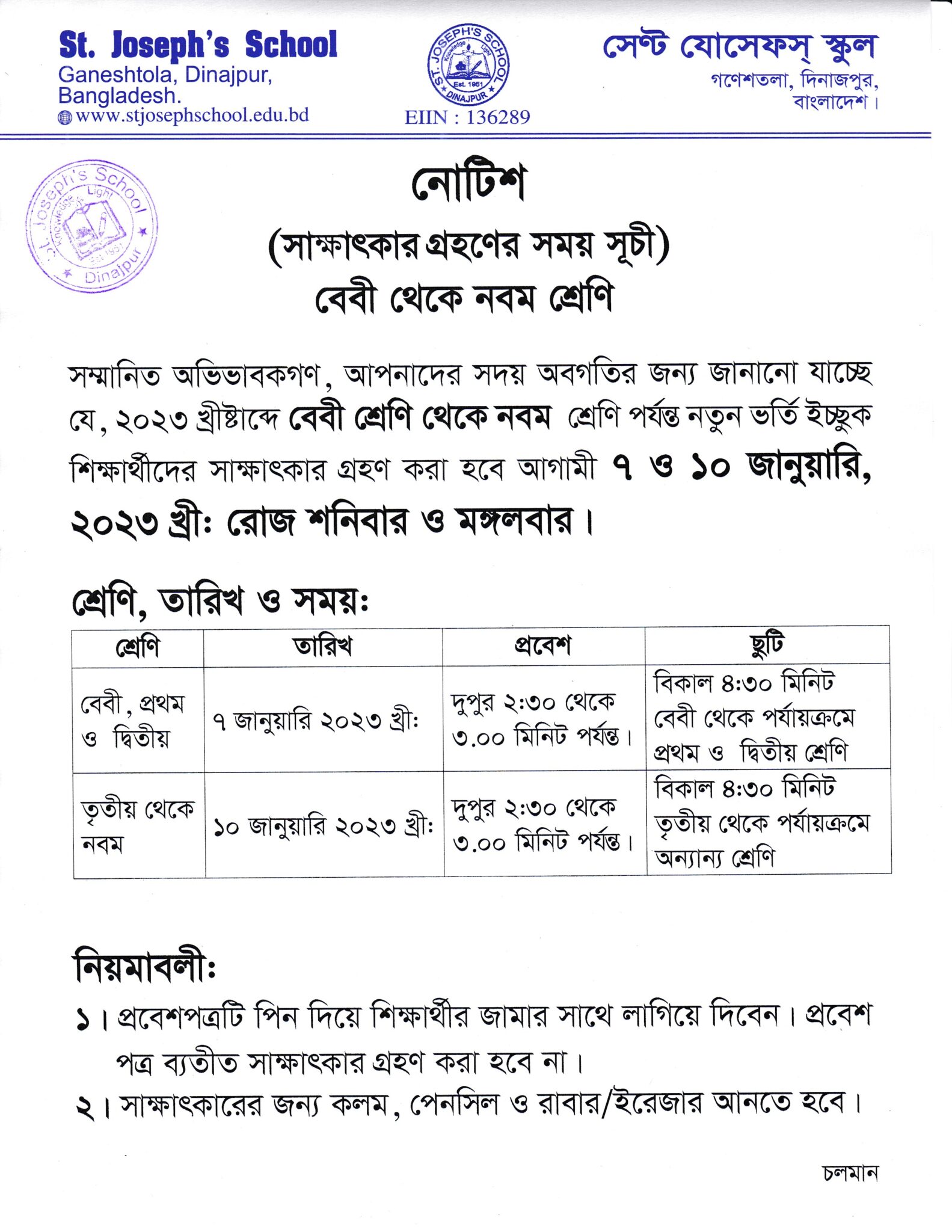২০২৩ খ্রীষ্টাব্দে বেবী শ্রেণি থেকে নবম শ্রেণি শিক্ষার্থীদের সাক্ষাৎকার গ্রহনের সময় সূচী প্রসঙ্গে