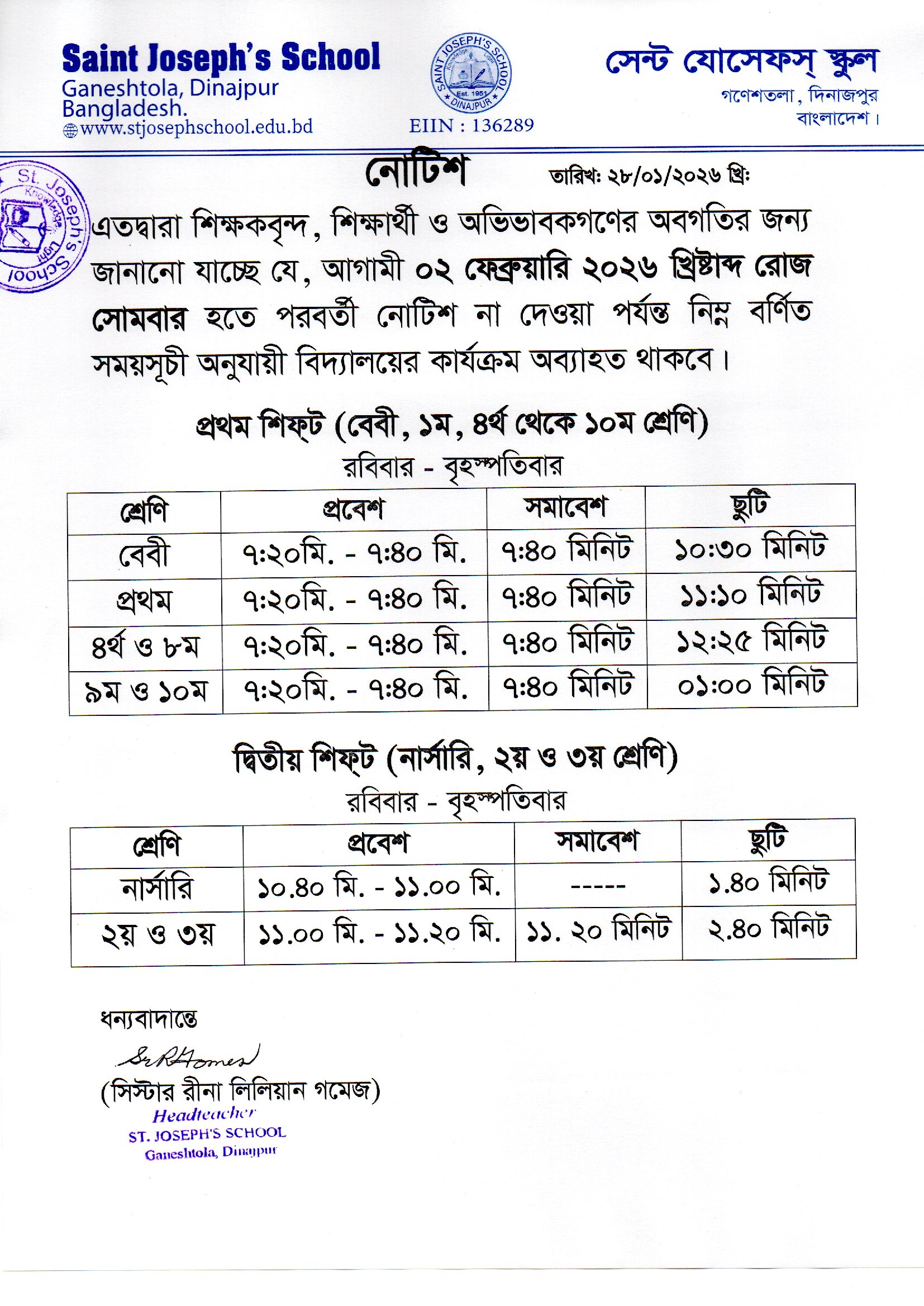 ২০২৬ খ্রি: বিদ্যালয়ের সময়সূচী প্রসঙ্গে