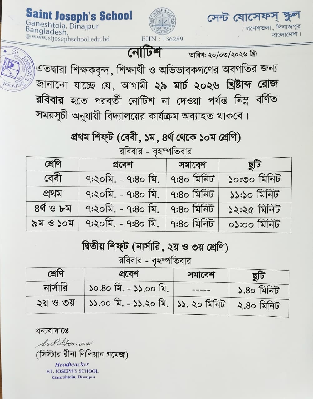 বিদ্যালয়ের ক্লাসের সময়সূচী প্রসঙ্গে ২০২৬ খ্রী: