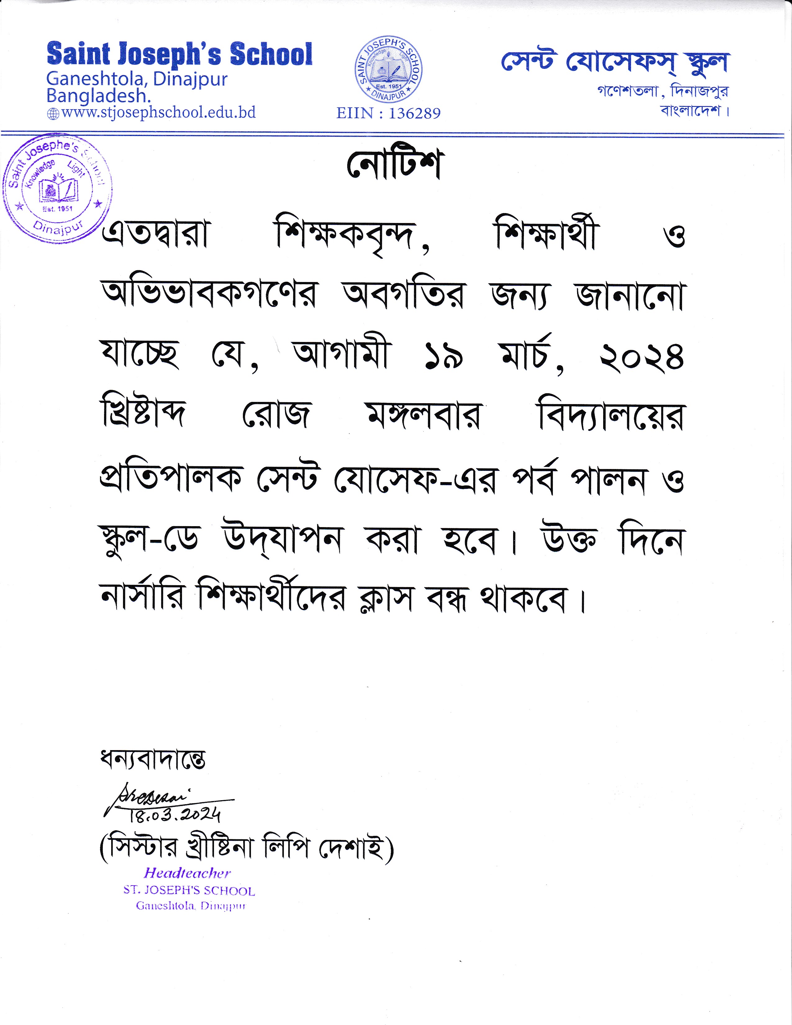বিদ্যালয়ের প্রতিপালক সেন্ট যোসেফ-এর পর্ব পালন ও স্কুল-ডে উদ্যাপন প্রসঙ্গে