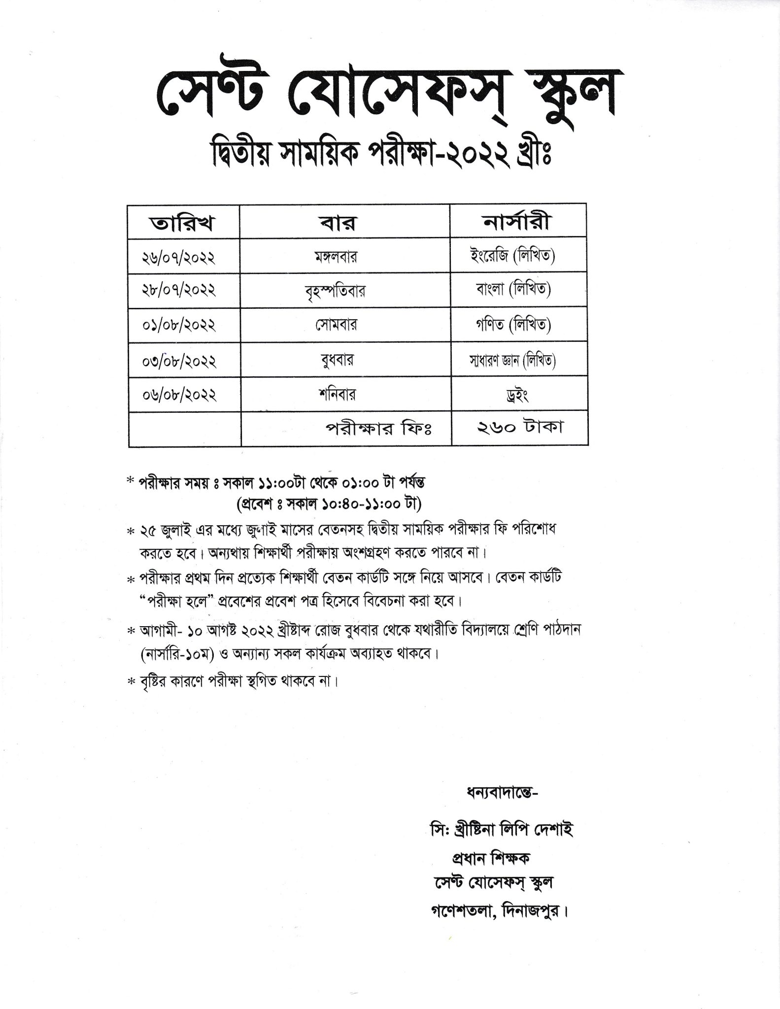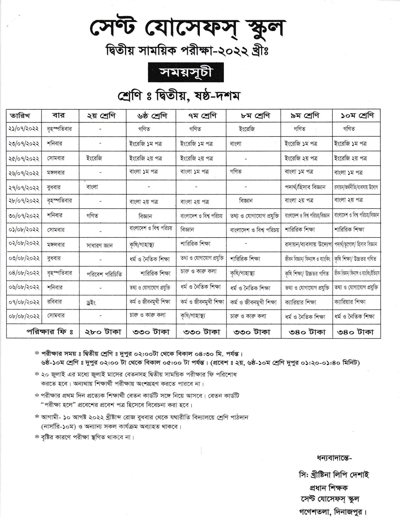 দ্বিতীয় সাময়িক এবং অর্ধ-বার্ষিক পরীক্ষার রুটিন ও সময়সূচী