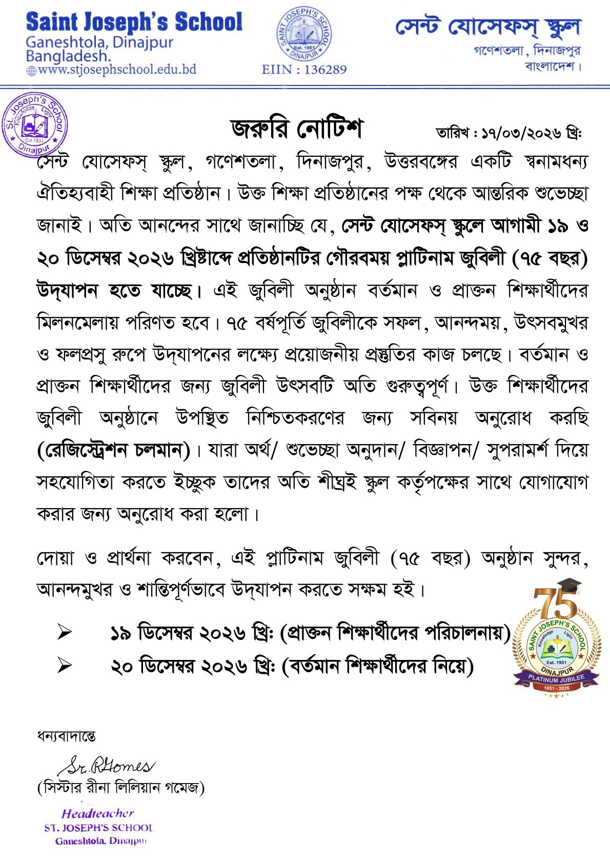 সেন্ট যোসেফস্ স্কুল এর প্লাটিনাম জুবিলী প্রসঙ্গে ২০২৬ খ্রিঃ