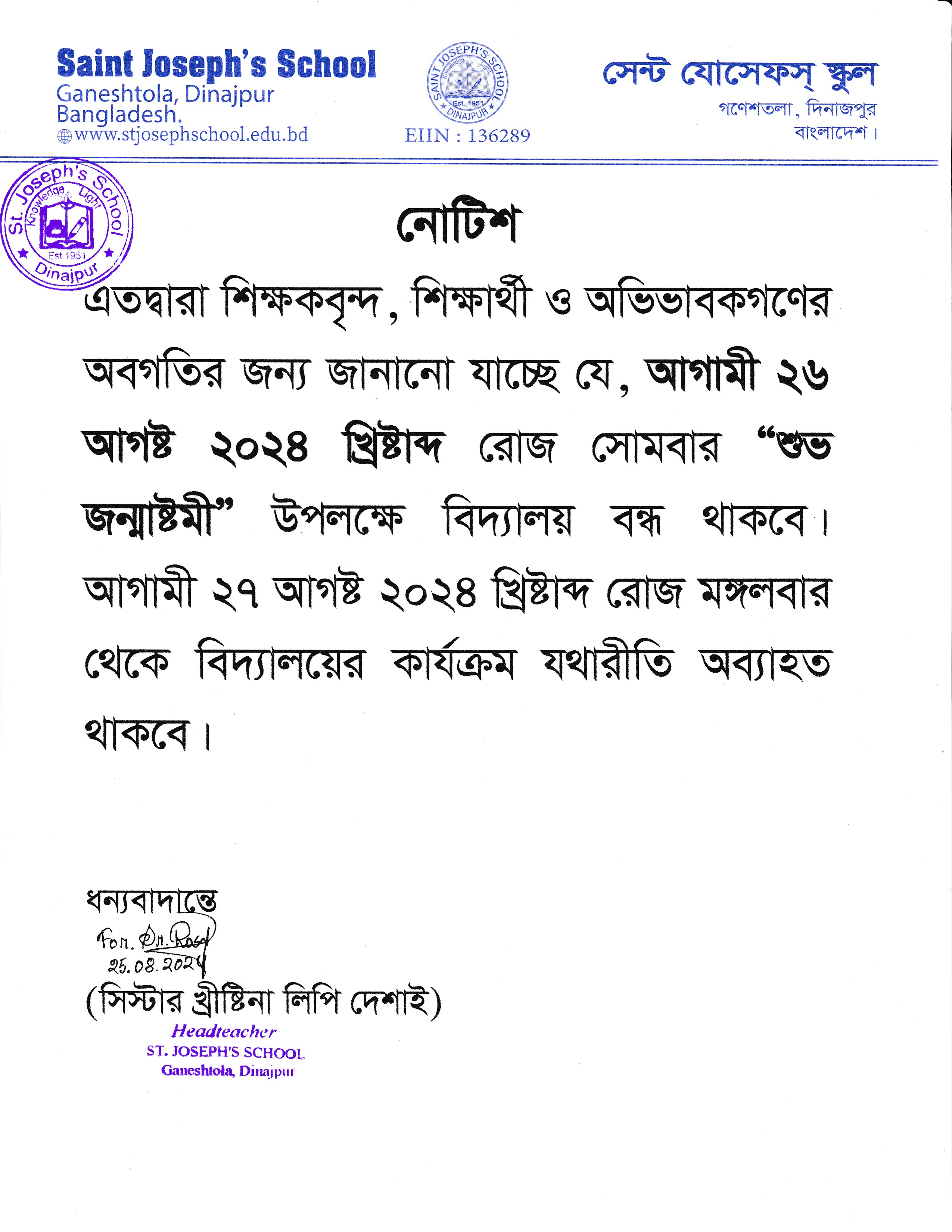 “শুভ জন্মাষ্টমী” উপলক্ষে বিদ্যালয় বন্ধ প্রসঙ্গে