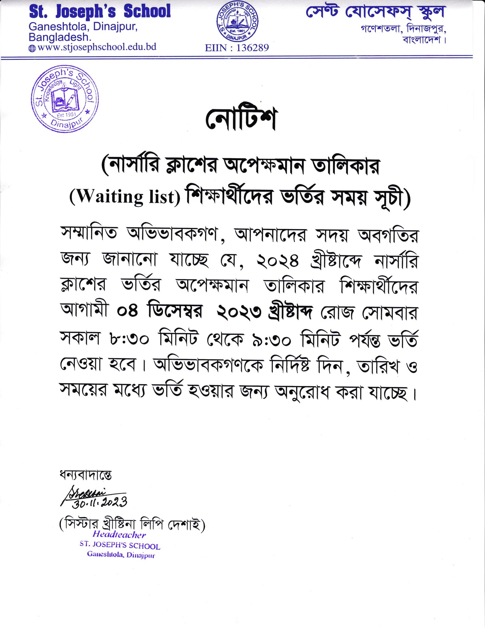 ২০২৪ শিক্ষাবর্ষে নার্সারি ক্লাশের অপেক্ষমান তালিকার শিক্ষার্থীদের ভর্তির সময় সূচী