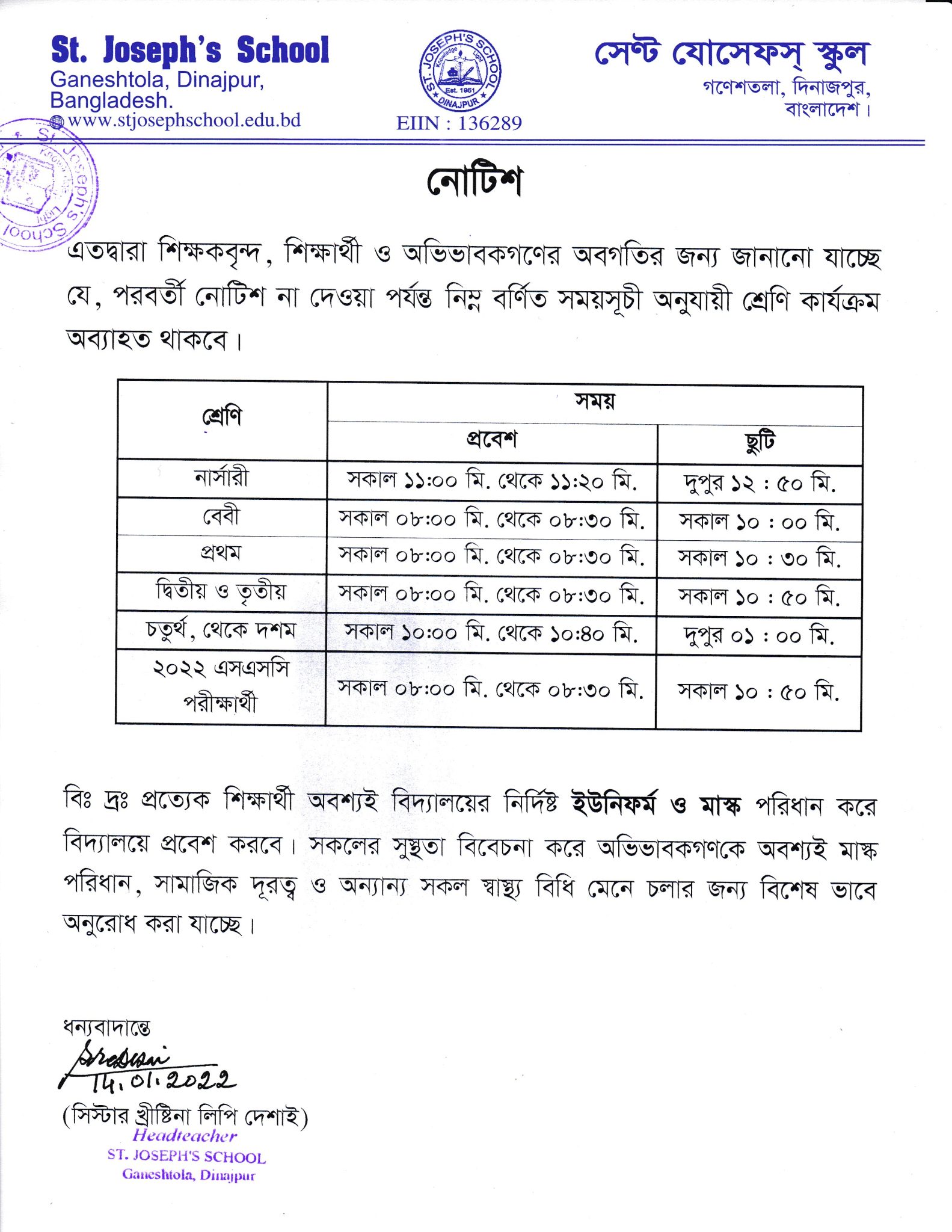 ২০২২ খ্রি: ক্লাসের সময়সূচী প্রসঙ্গে