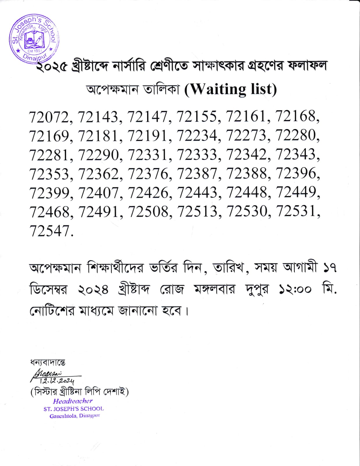 ২০২৫ খ্রিস্টাব্দে নার্সারি শ্রেণীতে সাক্ষাৎকার গ্রহণের ফলাফল অপেক্ষমান তালিকা (Waiting list)