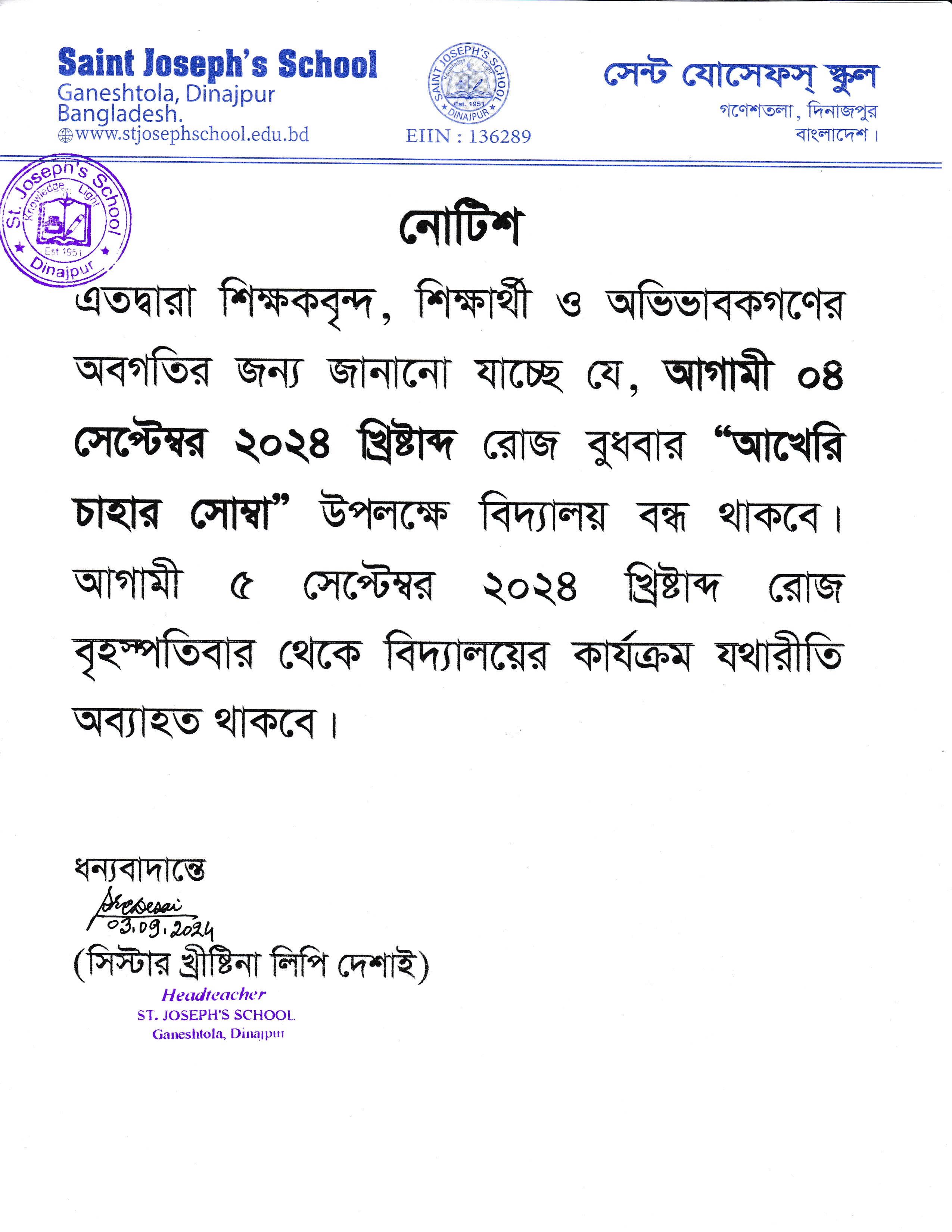 আখেরি চাহার সোম্বা উপলক্ষে বিদ্যালয় পাঠদান বন্ধ প্রসঙ্গে