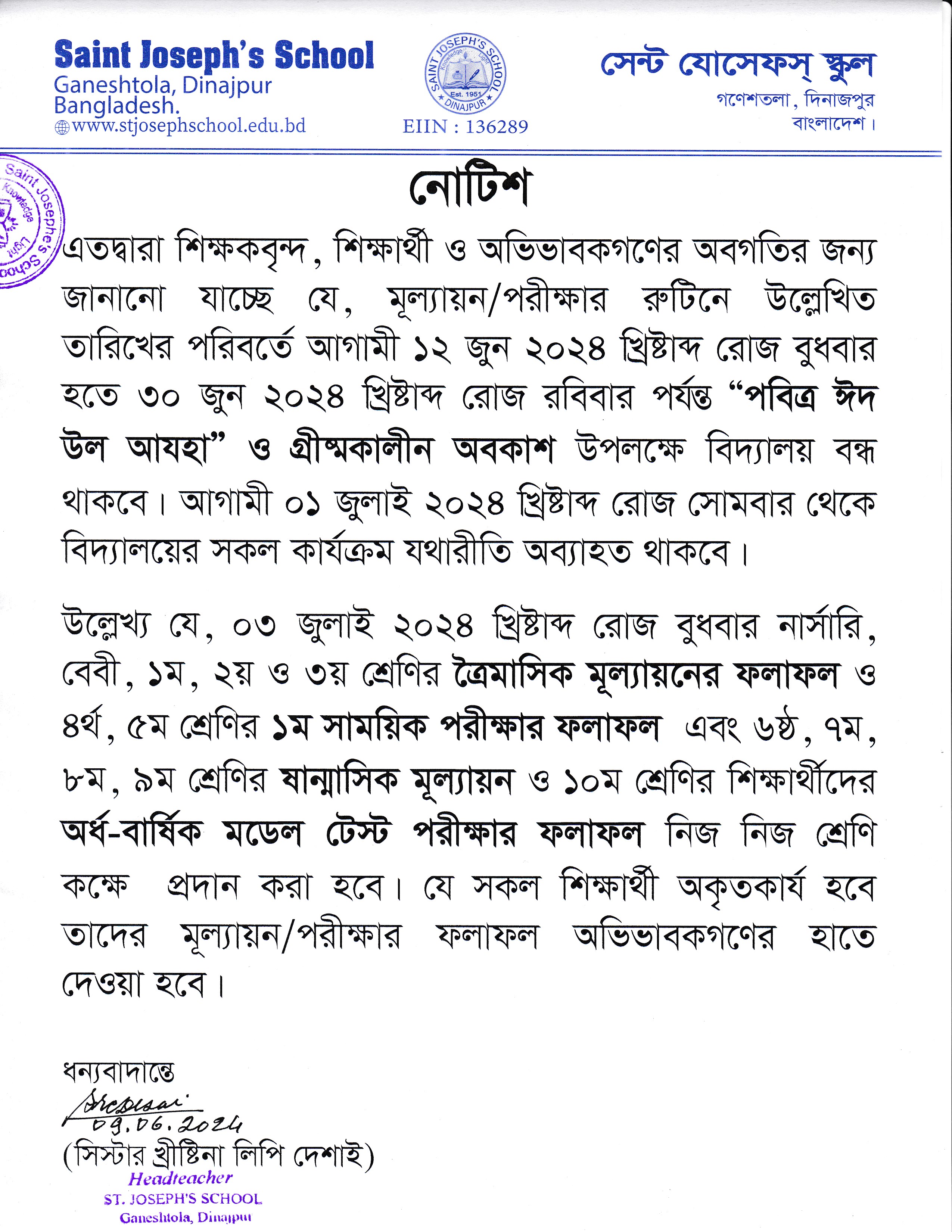 “পবিত্র ঈদ উল আযহা” ও গ্রীষ্মকালীন অবকাশ এবং ত্রৈমাসিক মূল্যায়ন/ষান্মাসিক মূল্যায়ন/১ম সাময়িক/অর্ধ-বার্ষিক মডেল টেস্ট পরীক্ষার ফলাফল প্রসঙ্গে