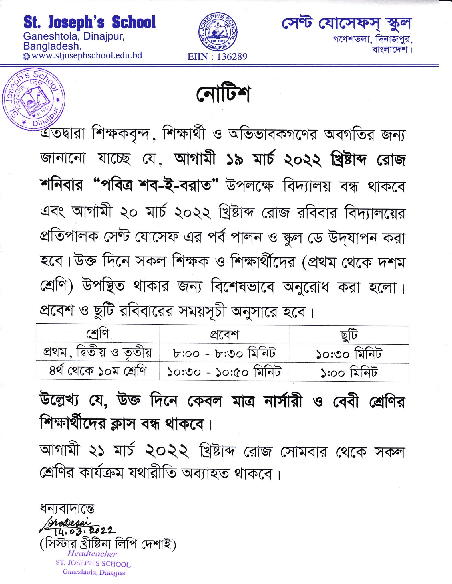 পবিত্র শব-ই-বরাত এর ছুটি ও স্কুল ডে উদ্ যাপন প্রসঙ্গে