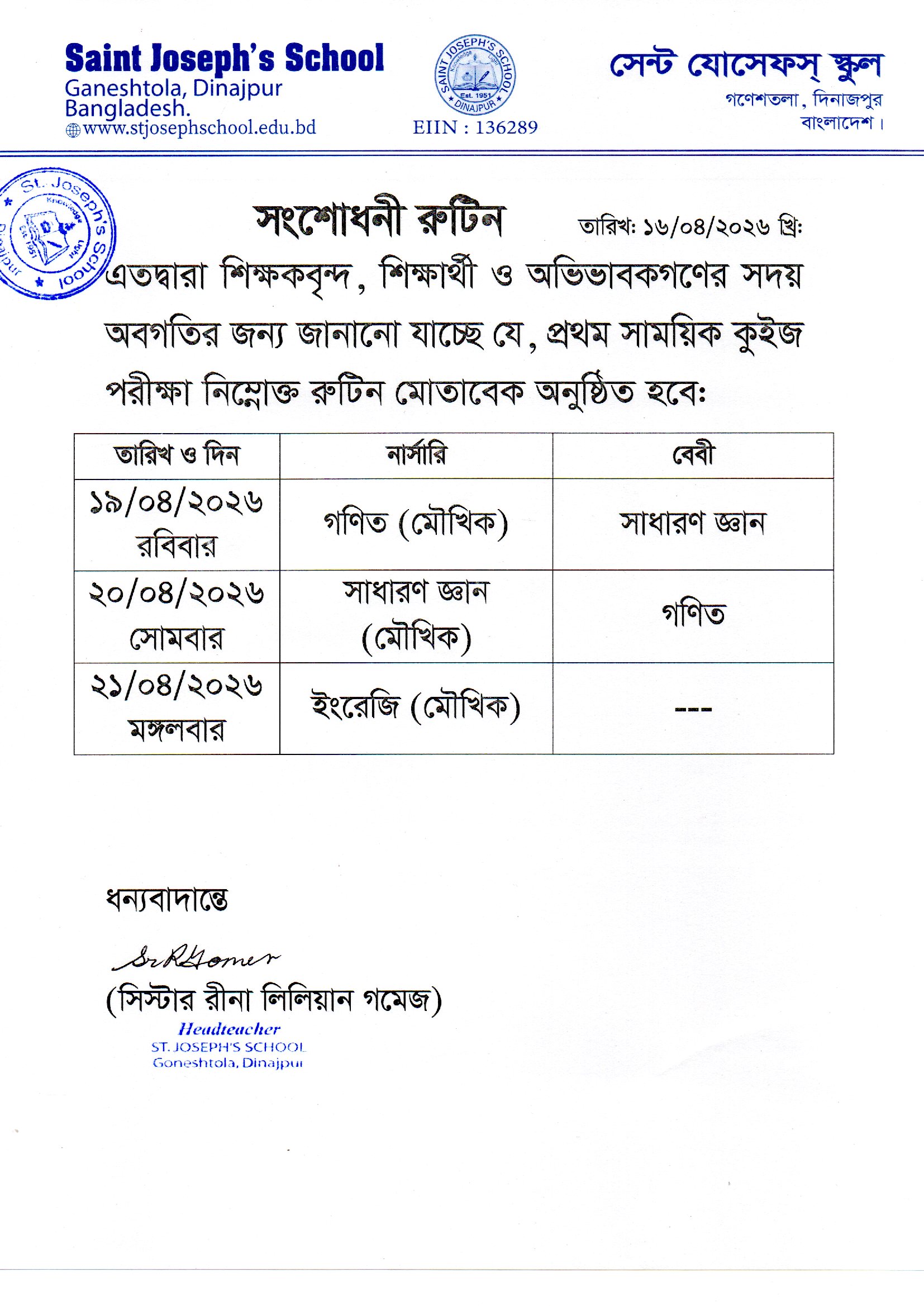 প্রথম সাময়িক কুইজ পরীক্ষার রুটিন ২০২৬খ্রি: